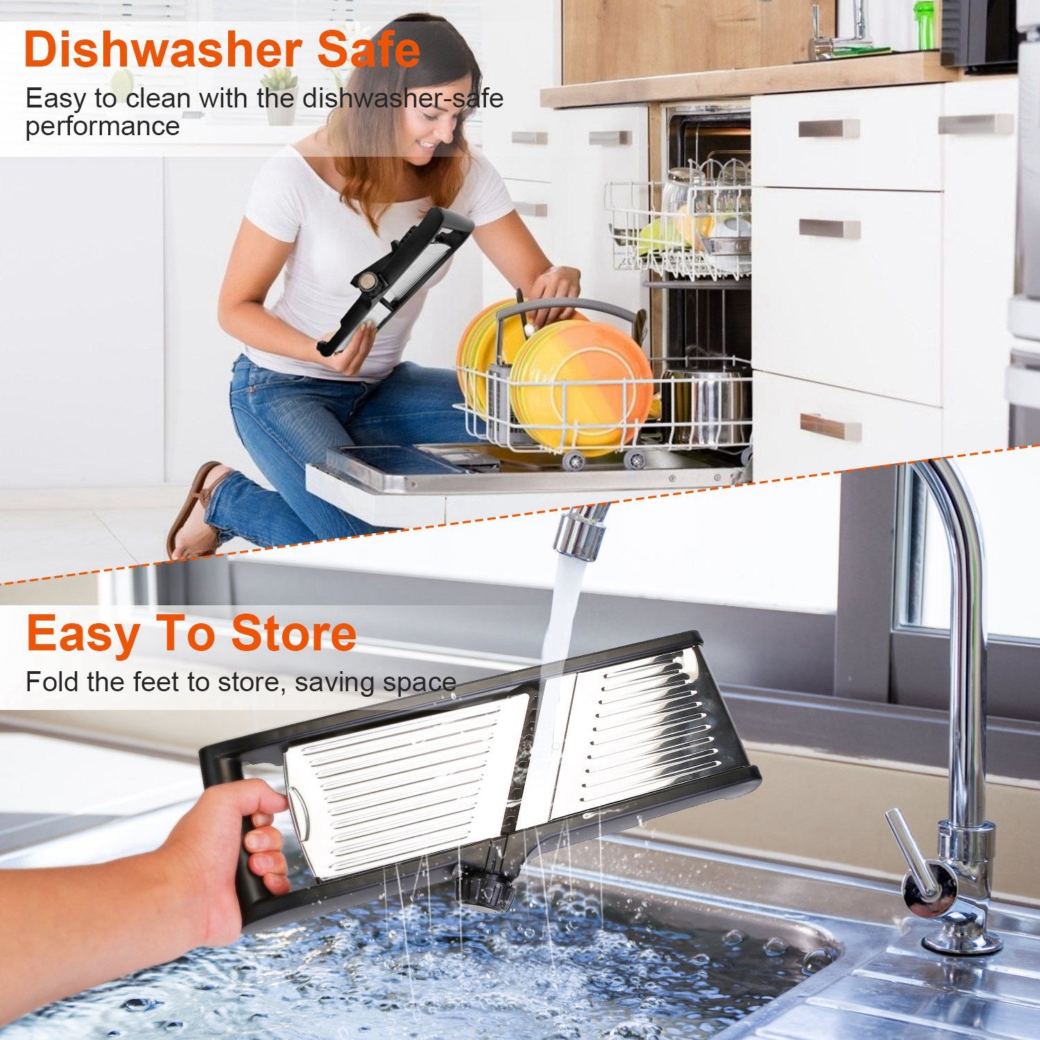 *Space Saving Food Slicer*: The blades are built-in and do not take up extra space. The non-slip feet can be folded for easy storage in a drawer,saving space.